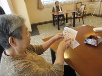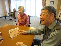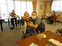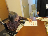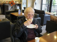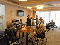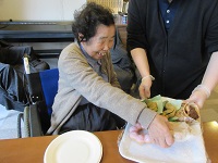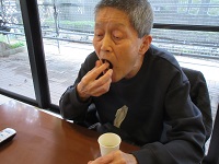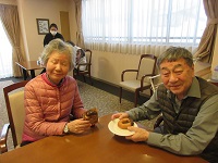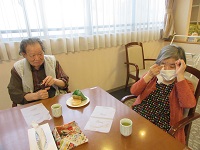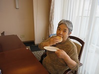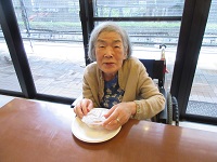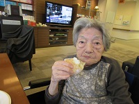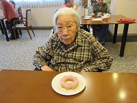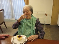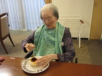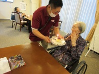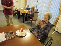 4階の入居者の皆さんと職員でハッピーバースデーの歌を歌っていただき、Y様も手拍子してくださいました。職員の声掛けにろうそくの火を吹き消していただき、召し上がってくださっています。