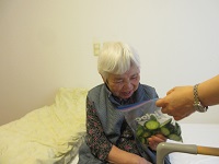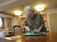 まずは入居者の方に、近くのまいばすけっとに買い物に行っていただき、長芋、きゅうり、みょうがを買ってきました。その後長芋、きゅうり、みょうがを切っていただき浅漬けの素で漬けています。お部屋にいた方にお願いし、もみ込んでいただきました。さあ、夕食をお楽しみに!