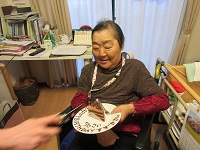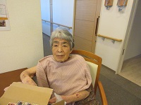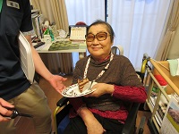 職員より「誕生日おめでとうございます!」との声掛けに「あら、ありがとう!」と満面の笑みで喜ばれていました。今日はおやつレクも重なり、甘い物がいっぱいなおやつの時間です。