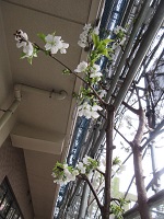 今、大規模修繕で施設の外壁が幕に覆われておりますが、サクランボの木の桜が健気に咲いております。施設の隙間から写真を撮りましたので、ご紹介させていただきます。