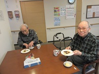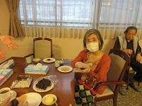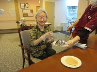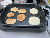 ホットケーキミックスに粒あんを挟んでいただき召し上がっていただきました。