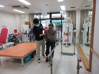 いつもは、車いすで移動されているS様のリハビリのご様子をご紹介させていただきます。写真を撮らせていただきましたら、笑顔を向けてくださいました。