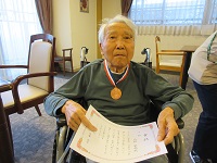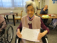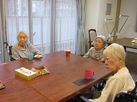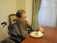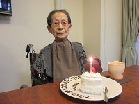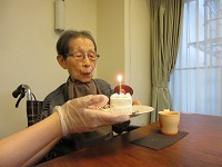N様お誕生日おめでとうございます。職員と入居者の方でお祝いをさせていただきました。お皿の文字をよく見られており、「これは職員が書いたものです」とお伝えすると「え!そうなの?」と驚かれていました。ろうそくの火をご自分で消されて、その後召し上がっていただきました。
