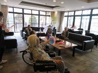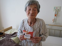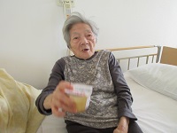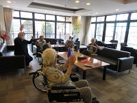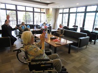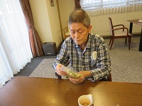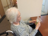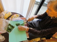 今日は白菜を職員が切って浅漬けにしてあるところへ、4階の方にオクラを切っていただきました。「そんなことできないよ」と仰っていましたが切ってくださいました。その後3階の方にオクラと白菜が入った袋をもみ込んでいただいています。「きれいな色だねえ。こうすればいいの?」など仰りながらもんでくださっています。
