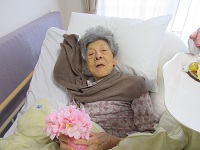 経管栄養の方なのですが、お口から少しずつ召し上がれるようになってきています。今日はお誕生日でプリンアラモードを介助で召し上がっていただきました。「うれしいわ!あなたたちいい方ね~。ありがとうね~。ほんとにおいしいわ!」など仰ってくださって2/3ほど召し上がってくださいました。ゼリーから始めて今はムセもなくプリンなどは召し上がれるようになって頑張っています。