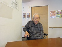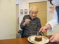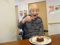 お誕生日の歌を職員が歌うと笑顔見られています。ろうそくの火を消してくださり召し上がってくださっています。「おいしいよ❤」と喜ばれていました。