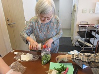 T様と買い物に行かせていただき、長芋ときゅうりを浅漬けにしています。皮むきや野菜を切るなどもお願いして頑張ってくださいました。