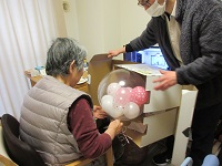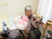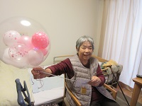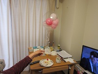 H様に職員からケーキと、ご家族様よりお届け物が届いていました。一緒に開けさせていただき、とてもきれいで感動されていました。