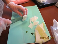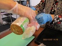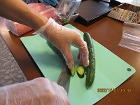 14時になり、5階ラウンジで漬物作りを開始しました。きゅうりは輪切り、大根は皮むき後銀杏切りにして浅漬けの素につけました。後は、夕食に5階の入居者様と一緒に召し上がる予定です。