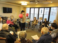 本日のリハスタッフの集団レクは、ボールと合唱でした。リズムに合わせて、4階、5階のご入居者様と開催しました。合唱は、皆様好きなレクで、皆様、嬉しそうなお顔で参加されておりました。