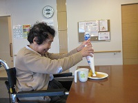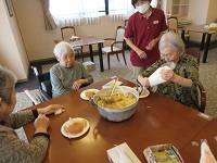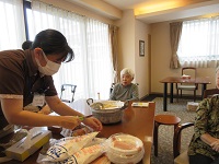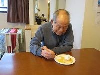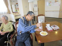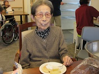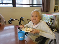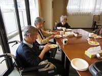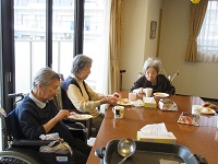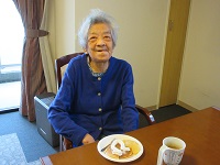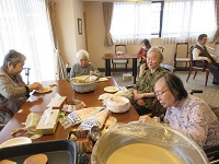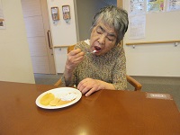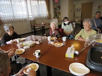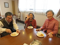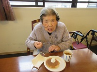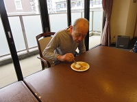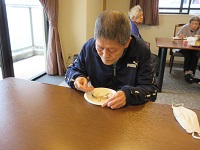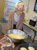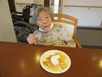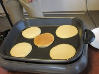 今日は皆様とホットケーキを焼いています。そこに季節のりんごを甘く煮て、生クリームと添えています。