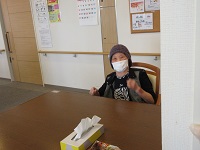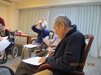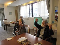 テレビ画面を見ながら体操をしてくださっています。腕や足を動かしてくださり、疲れてしまったのか体操の後はご自分で肩をもみほぐしていました。音楽に合わせての動きは自然に手足が動いていいですね!