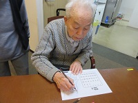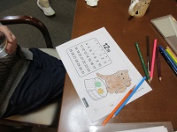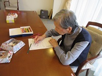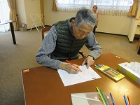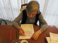 熱心に色鉛筆で塗ってくださっていました。「私は苦手なんだよなあ」など仰りながらもきれいに塗ってくださいました。「部屋に飾ってもいいの?」と喜ばれています。