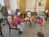 ボールの大きさをいろいろ変えながらゴールに入れていただきました。なかなか近くても入らず「も~、なんで入らないのよ」と仰りながらも何度も挑戦されていました。