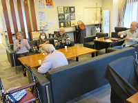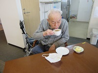 職員がおやつの声掛けをすると居室から出てきてラウンジまでいらっしゃっています。「ここが痛いんだよな。チクチクするんだ」と仰っており靴下を脱がれている。看護師が見ると「骨が変形している」とのこと。様子を見ながら病院受診も考えていきます。