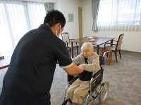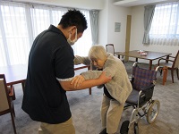 B様は、車いすで移動をされておりますが、手引き歩行の訓練の為に、介護スタッフとともに頑張っております。