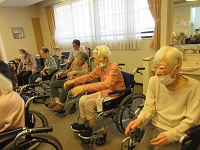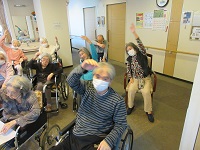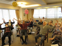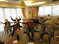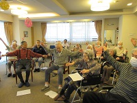 毎週木曜日に開催しているリハビリレク。本日は、昔懐かしのラジオ体操です。ご入居者様、覚えておられる方が多く、真剣に取り組まれております。
