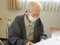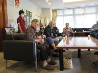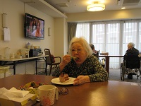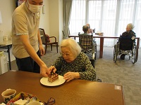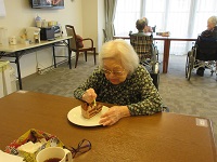他の入居者の方々に「おめでとうございます!」との声掛けに「ありがとうございます」と手を合わせながら喜んでくださっています。「1人で食べちゃっていいの?」と遠慮されていました。
