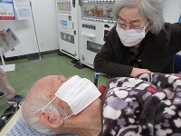 K様の入院中のご主人の病院しているところに面会に伺いました。前回は、座っての面会でしたが、今回は、ご主人のお顔が良く見えるように頑張って立ってお話をされておりました。今回も、面会のご協力を頂いた病院様、ありがとうございます。