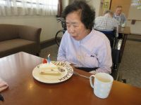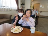 本日は、K様のお誕生日でした。K様が美味しそうにケーキを召し上がられいるところを後ろの席のご入居者様が、羨ましそうな表情で