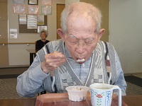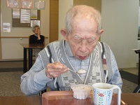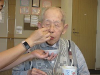 ご家族様よりアイスが届いています。今日は小豆氷に練乳が入っているアイスです。硬く食べにくそうにしていたため、初めだけ職員が介助し、後は美味しそうに召し上がっています。毎日暑いですが、アイスを食べて乗り切りましょう!