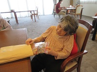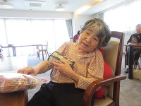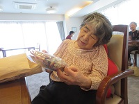 妹様より贈り物が届いています。ご本人様に届けると「え!なんだろう?」と仰りながら開けてみると体によさそうなお菓子が届いていました。「ありがとう。うれしいね」と喜ばれています。