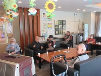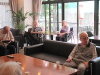 毎週楽しみにされているカラオケの時間です。1時前から「そろそろかな?」などと仰って1階のラウンジに集まってきています。密にならないように気を付けて楽しまれていました。