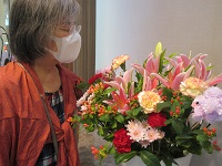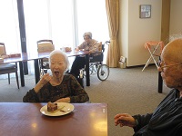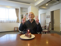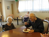 「おめでとうございます」との声掛けに「ありがとう」とポーズを取っていただきました。大好きなケーキを召し上がり、隣で一緒に祝ってくれた奥様にも「美味しいよ」と差し出す感じがとても微笑ましく見せていただきました。来年もご夫婦一緒にお祝いさせていただきます。