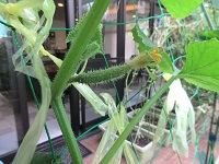 ゴーヤがずんぐりしていますが約10cm迄成長しました。2代目きゅうりも3cm程の実が2個、なり始めました