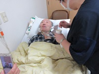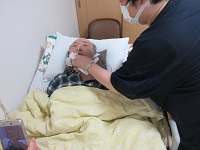 お口からのお食事が難しくなっているN様に、お口の中のケアを、3日前からお茶で対応しておりますが、お茶でお口のケアの後、少しお茶を含ませて頂きましたら、ごくっと飲まれましたので、奥様と相談させて頂き、N様のお好きな飲み物のオレンジジュースを用意して頂きました。今日は、緑茶でのお口のケアの後、オレンジジュースを含ませて頂き、もっと飲まれますかの声掛けにお口を開けられ、ごくっと飲まれ、まだ飲まれますかの声掛けにもお口を開けられ、5回程飲まれました。その様子を奥様もご覧になられ喜ばれておりました。N様、少しづつ飲み方が上手になってます。頑張ってくださいね。
