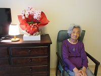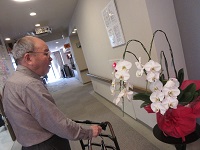 冷たいお茶を買うために、1階の自動販売機に来られているN様がいらっしゃいます。買ったお茶が自販機から取りにくいため、お手伝いさせていただくと「いつもありがとう」と仰ってくださいます。帰り際に胡蝶蘭に目をとめて「昔は胡蝶蘭育てていたんだけどなあ。盆栽なんかもたくさんあったんだよ。菊は難しかったなあ」など仰っていました。