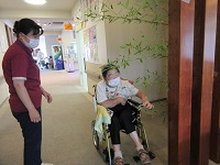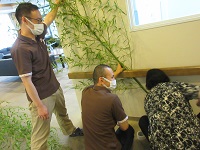 男性職員と施設長で竹を飾っています。竹を飾ることで涼やかになりました。第一号の入居者の方が飾ってくださいました。明日はどなたが飾ってくださるか楽しみです。