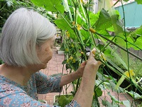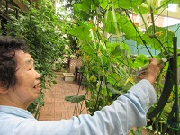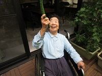 きゅうりの収穫をお願いすると、「あら、私でいいの?」と仰りながら取ってくださり「とったどー!」のポーズをしてくださっています。次はなにが収穫できるか楽しみです。