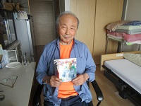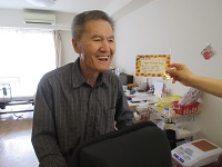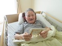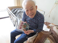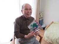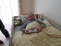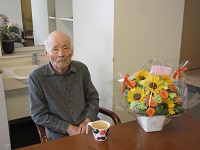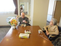 娘様より送られたお花のプレゼントが届きました。「きれいですねえ」と奥様とうなずかれています。居室に飾らせていただきました。