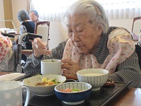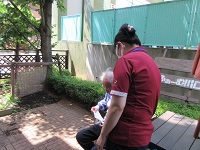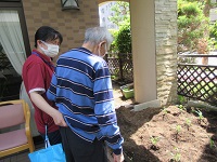 H様が、リハビリの為、1階のラウンジで歩行訓練をされておりましたので、プランターの野菜の事をお伝えし、見てみるとの事から、野菜を見ながらウッドデッキでの歩行訓練の様子をご紹介させて頂きます。ウッドデッキではありますが、外での歩行が楽しかったとの事でした。写真撮影ありがとうございます。💛