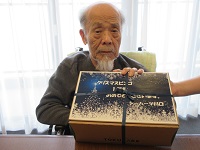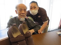 12月のクリスマスビンゴで1位の商品が介護用シューズでした。1位のT様は、その時は、新しい介護シューズ👞を購入したばっかりでしたので、4月になってから、フィッティングをし、本日、プレゼントさせて頂きました。