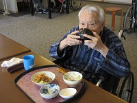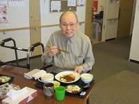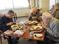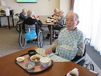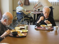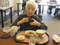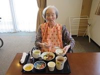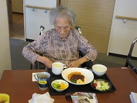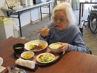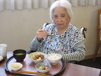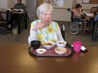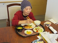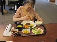 「あ、海老フライだ!ハンバーグも柔らかくておいしい」「ポタージュスープ飲んじゃった」