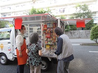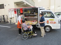 毎週火曜日は、移動スーパーとくし丸の日です。今回は、3階、5階の入居者様の買い物の日となっております。とくし丸のワゴンでは、果物、お菓子、総菜、日用品と色々な商品があり、「〇〇なんてないよね?」に「あります」と回答されびっくりするほどです。