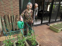 さやえんどうの植え付けをしたO様が、水やりしてくれました。いつも、O様は、野菜に声掛けしてくれる野菜思いのご入居者様です。さやえんどうに変わっていつもありがとうございます💛やさしいO様💛