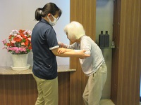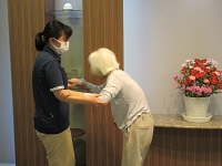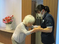 K様のリハビリで1階の廊下を歩行訓練をされておりました。ご自身で歩行に合わせて、イチ、ニ、サン、シ、ゴと掛け声を出しながら歩行訓練されているところを見せて下さいました。実は、歩行訓練は、リハビリ室で行った後、遊びに事務所に来てくださって、頑張って訓練したとお話をして下さいましたので、写真が撮りたかったとお伝えしたら、また、歩行訓練して下さいました。写真撮影に応えて下さいました。ありがとうございます💛