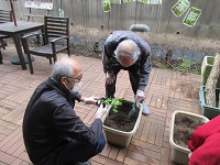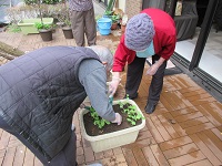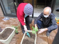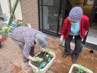 O様、K様、N様と一緒にさやえんどうの植え付けを行いました。手が汚れないように、手袋して頂き、スコップで穴を掘り、植え付けです。まっすぐ苗が成長できるように、何度か、手直しをされ、真剣に行ってくれました。明日から、水やりの作業がありますが、必ず、自分達で行うので、声掛けをして下さいと話されながら、居室に戻られました。元気に苗になるように、皆様、ご協力お願いします。そして、ありがとうございます🌱