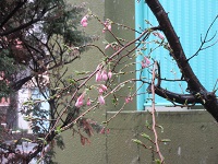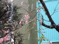 施設の早咲きの桜がどうにか開花しそうです。本日の雨や霙にも負けずに花が開きそうです。
