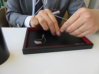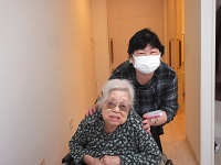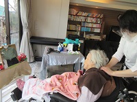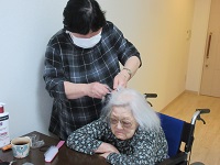 N様から、最近、補聴器の調子が悪く聞こえづらいとのお話があり、それでは、施設の近くの眼鏡市場で、補聴器の状態見てもらいに行きましょうとの事で、ケアマネとともに、眼鏡店に行き状態見て頂きました。結果、補聴器に汚れがついていた事が原因との事で、念入りに掃除をして頂きました。掃除後の補聴器は、とってもよく聞こえるとお話をされておりました。少し緊張されていたようでしたが、無事に清掃だけで修理が完了されとても喜ばれておりました。写真は、やや緊張されているところと作業風景です。