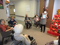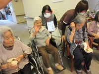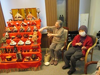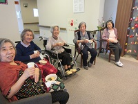 今日は、お雛様女子会を1階ロビーのお雛様の前で開催しました。今日のおやつは、桜餅と雛あられです。おやつの準備で各階に伺った時に、女子会に参加して下さる方を募集、約10名程のご参加を頂きました。女子会では、甘酒も召し上がっていただき、ひな祭りの唄を合唱、自然と笑顔がこぼれ、楽しいひと時を過ごしていただきました。笑顔のショットをご紹介いたします。