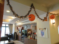 介護リーダーの内山さんと飾りつけしました。飾りつけが終わると入居者の皆さん喜んでくださっています。「すごいきれいね」「賑やかになっていいね」「かぼちゃのお祭り?」等コロナ禍で外出できない中でも皆さんの笑顔見られています。