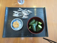 川口ふぁーむで栽培中のキュウリが2本食べごろになり、収穫を行い、ご入居者様のリクエストで、みそで食べたいとの事で、みそキュで食べる事になり、取れたてのキュウリの表面にイガイガがついている状態でしたので、