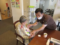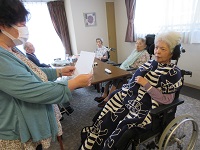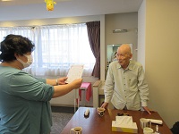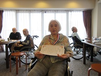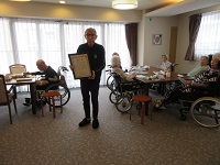 本日は、T様のお誕生日です。ご本人のご希望は、手作りの花飾りでしたので、介護リーダーの内山さんの手作りの花飾りをプレゼントしました。写真は緊張するとの事で、やや固い表情でしたが、喜んで頂けたようです。