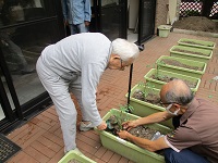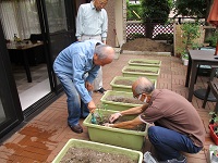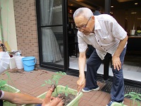 ジャガイモの収穫後のプランターにトマトの苗植えをご入居者様とともに行いました。今回の参加者には、車いすのO様も、頑張って参加してくださいました。トマトは、収穫して生のまま、食せるので、昨年も栽培しましたが、好評でしたので、今年も栽培します。今年は、緑のカーテンとして、ゴーヤも栽培してます。