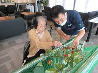 天気が良かったので、ご入居者様とともに、屋上散策をしました。コロナでまだまだ、自由な散歩はできませんので、屋上で気分転換をして頂きました。