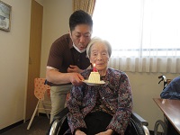 本日、Y様のお誕生日です。ご本人の希望で、ショートケーキを食べたいとの事でした。お花とプレゼントをお渡ししました。特にお花はサプライズでしたので、喜ばれておりました。